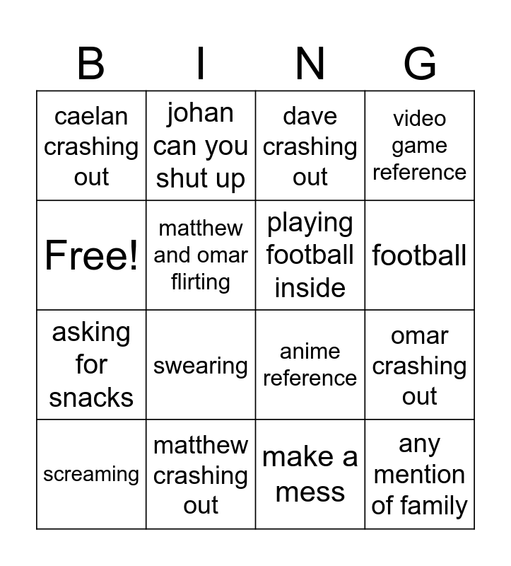 This bingo card has 16 words: matthew crashing out, omar crashing out, dave crashing out, caelan crashing out, asking for snacks, johan can you shut up, anime reference, make a mess, Free!, matthew and omar flirting, screaming, video game reference, swearing, football, playing football inside and any mention of family.