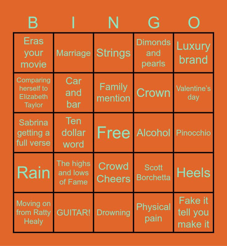 This bingo card has a free space and 24 words: The highs and lows of Fame, GUITAR!, Family mention, Moving on from Ratty Healy, Luxury brand, Eras your movie, Comparing herself to Elizabeth Taylor, Marriage, Alcohol, Crowd Cheers, Crown, Sabrina getting a full verse, Scott Borchetta, Heels, Car and bar, Physical pain, Pinocchio, Strings, Valentine’s day, Ten dollar word, Fake it tell you make it, Rain, Dimonds and pearls and Drowning.