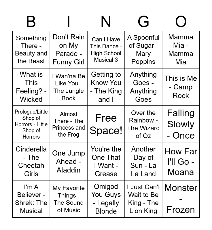 This bingo card has a free space and 50 words: Seasons of Love - RENT, Monster - Frozen, One Day More - Les Misérables, Omigod You Guys - Legally Blonde, One Jump Ahead - Aladdin, There's a Fine Fine Line - Avenue Q, Don't Rain on My Parade - Funny Girl, Cell Block Tango - Chicago, What is This Feeling? - Wicked, That's How You Know - Enchanted, I Wan'na Be Like You - The Jungle Book, A Spoonful of Sugar - Mary Poppins, How Far I'll Go - Moana, Another Day of Sun - La La Land, When Will My Life Begin? - Tangled, Agony - Into the Woods, Getting to Know You - The King and I, Over the Rainbow - The Wizard of Oz, My Shot - Hamilton, Mamma Mia - Mamma Mia, Almost There - The Princess and the Frog, I Just Can't Wait to Be King - The Lion King, Something There - Beauty and the Beast, Anything Goes - Anything Goes, I Won't Say (I'm In Love) - Hercules, Reflection - Mulan, This is Me - Camp Rock, Kiss the Girl - The Little Mermaid, Can I Have This Dance - High School Musical 3, You're the One That I Want - Grease, Waving Through a Window - Dear Evan Hansen, So This Is Love - Cinderella, The Phantom of the Opera - The Phantom of the Opera, The Greatest Show - The Greatest Showman, My Favorite Things - The Sound of Music, Proud Corazón - Coco, You Can't Stop the Beat - Hairs[ray, Freeze Your Brain - Heathers: The Musical, Show Off - The Drowsy Chaperone, Falling Slowly - Once, Always Look on The Bright Side of Life - Spamalot, Footloose - Footloose, This Is Halloween - The Nightmare Before Christmas, Once Upon a December - Anatasia, I'm A Believer - Shrek: The Musical, Prologue/Little Shop of Horrors - Little Shop of Horrors, Singin' in the Rain - Singin' in the Rain, Man or Muppet - The Muppets, Cinderella - The Cheetah Girls and Sherry - Jersey Boys.