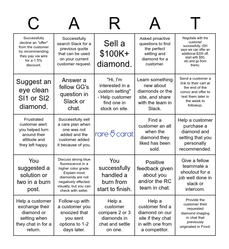 This bingo card has a free space and 24 words: Discuss strong blue fluorescence in a higher color grade. Explain most diamonds are not negatively effected visually, but you can check with seller., Follow-up with a customer you snoozed that you sent options to 1-2 days later., "Hi, I'm interested in a custom setting" - Help customer find one in stock on site., Help a customer exchange their diamond or setting when they chat in for a return., Negotiate with the customer successfully. (SH says we can offer an additional $200 off, start with $50, etc.and go from there)., Successfully decline an "offer" from the customer by recommending they pay via wire for a 1.5% discount., Suggest an eye clean SI1 or SI2 diamond., Successfully search Slack for a previous quote that can be used on your current customer request., Find a customer an alt when the diamond they liked has been sold., You successfully handled a burn from start to finish., Learn something new about diamonds or the site, and share with the team in Slack., Frustrated customer alert: you helped turn around their attitude and they left happy., Positive feedback given about you and/or the RC team in chat., Give a fellow teammate a shoutout for a job well done in slack or intercom., Answer a fellow GG's question in Slack or chat., Help a customer find a diamond on our site if they chat in with one from a competitor., Help a customer purchase a diamond and setting that you personally recommended., Sell a $100K+ diamond., Send a customer a link to their cart at the end of the convo and offer to text them later in the week to followup., Successfully sell a care plan when one was not added and the customer added it because of you., Provide the customer their requested diamond imaging in chat that previously originated in Front., You suggested a solution or two in a burn post., Asked proactive questions to find the perfect setting and diamond for a customer. and Help a customer compare 2 or 3 diamonds in chat and settle on one..