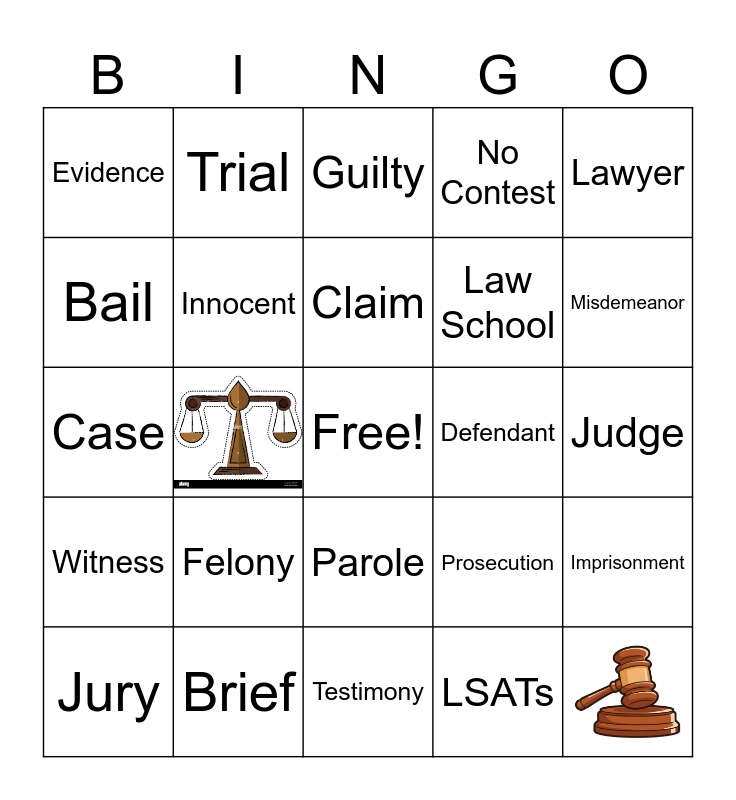 This bingo card has 2 images, a free space and 22 words: Felony, Brief, Claim, Jury, Lawyer, Evidence, Bail, Trial, Defendant, Parole, Law School, Case, Prosecution, Imprisonment, Innocent, LSATs, Judge, Guilty, Misdemeanor, Witness, No Contest and Testimony.