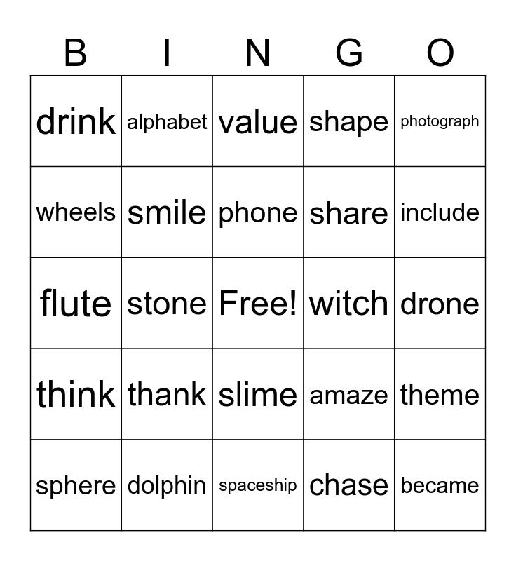 This bingo card has a free space and 24 words: thank, dolphin, phone, sphere, photograph, drink, wheels, alphabet, witch, slime, share, flute, amaze, theme, smile, chase, drone, value, include, stone, became, think, shape and spaceship.