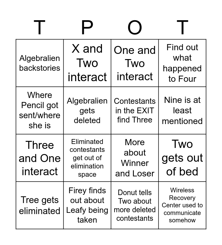 This bingo card has 16 words: Firey finds out about Leafy being taken, Two gets out of bed, One and Two interact, Algebralien backstories, Three and One interact, X and Two interact, More about Winner and Loser, Donut tells Two about more deleted contestants, Where Pencil got sent/where she is, Algebralien gets deleted, Tree gets eliminated, Find out what happened to Four, Eliminated contestants get out of elimination space, Nine is at least mentioned, Contestants in the EXIT find Three and Wireless Recovery Center used to communicate somehow.