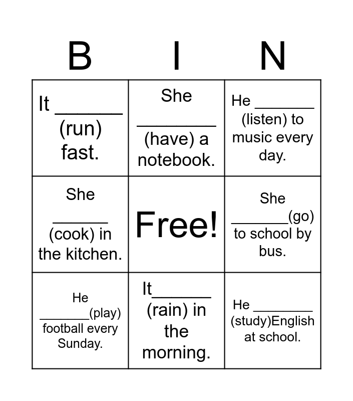 This bingo card has a free space and 8 words: She _______(go) to school by bus., He _______ (listen) to music every day., She ________ (have) a notebook., He _______(play) football every Sunday., It ______ (run) fast., He ________ (study)English at school., She ______ (cook) in the kitchen. and It______ (rain) in the morning..