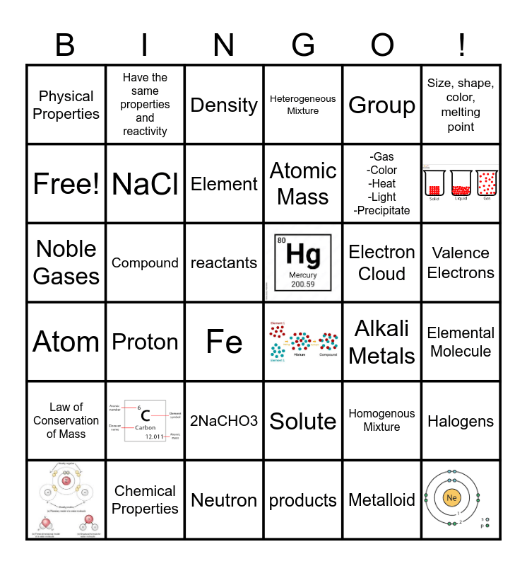 This bingo card has 6 images and 30 words: Atom, Proton, Neutron, Atomic Mass, Electron Cloud, Valence Electrons, Physical Properties, Chemical Properties, Density, Solute, -Gas -Color -Heat -Light -Precipitate, Size, shape, color, melting point, Law of Conservation of Mass, Compound, Element, Heterogeneous Mixture, Homogenous Mixture, Elemental Molecule, Free!, NaCl, Fe, Alkali Metals, Halogens, Noble Gases, Have the same properties and reactivity, reactants, products, Group, 2NaCHO3 and Metalloid.