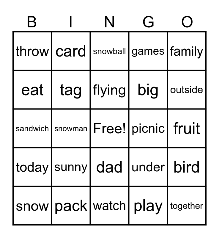 This bingo card has a free space and 29 words: snow, build, snowman, yard, throw, snowball, tag, sunny, picnic, pack, fruit, together, watch, play, outside, dog, dad, today, family, sandwich, under, tree, big, eat, games, card, bird, flying and also.