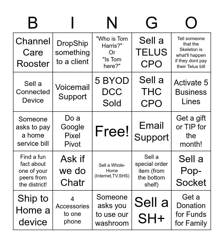 This bingo card has a free space and 24 words: Ask if we do Chatr, 4 Accessories to one phone, 5 BYOD DCC Sold, Ship to Home a device, Tell someone that the Skeleton is what'll happen if they dont pay their Telus bill, Channel Care Rooster, Sell a Connected Device, DropShip something to a client, Email Support, Sell a Whole-Home (Internet,TV,SHS), Sell a THC CPO, Someone asks to pay a home service bill, Sell a special order item (from the bottom shelf), Sell a Pop-Socket, Voicemail Support, Sell a SH+, Get a gift or TIP for the month!, "Who is Tom Harris?" Or "Is Tom here?", Activate 5 Business Lines, Do a Google Pixel Pivot, Get a Donation for Funds for Family, Find a fun fact about one of your peers from the district!, Sell a TELUS CPO and Someone asks you to use our washroom.