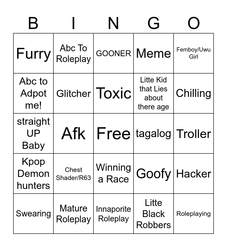 This bingo card has a free space and 24 words: Chest Shader/R63, Mature Roleplay, Toxic, Swearing, Femboy/Uwu Girl, Furry, Abc to Adpot me!, Abc To Roleplay, tagalog, Winning a Race, Litte Kid that Lies about there age, straight UP Baby, Goofy, Hacker, Glitcher, Litte Black Robbers, Troller, GOONER, Chilling, Afk, Roleplaying, Kpop Demon hunters, Meme and Innaporite Roleplay.