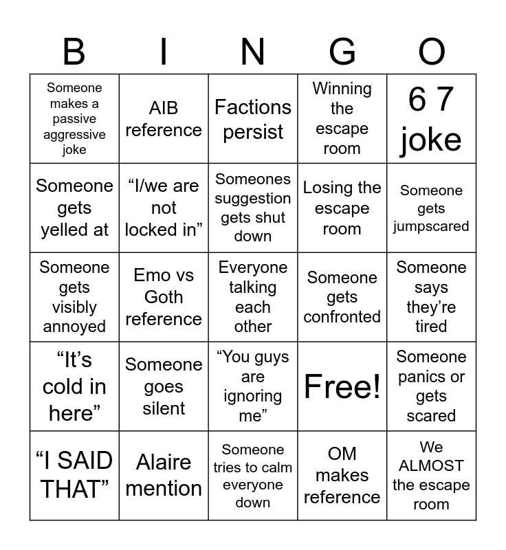 This bingo card has 25 words: Someone goes silent, Someone tries to calm everyone down, Someones suggestion gets shut down, “I SAID THAT”, 6 7 joke, Someone makes a passive aggressive joke, Someone gets yelled at, AIB reference, Someone gets confronted, “You guys are ignoring me”, Losing the escape room, Someone gets visibly annoyed, Free!, Someone panics or gets scared, “I/we are not locked in”, We ALMOST the escape room, Someone says they’re tired, Factions persist, Someone gets jumpscared, Emo vs Goth reference, Everyone talking each other, Alaire mention, “It’s cold in here”, Winning the escape room and OM makes reference.
