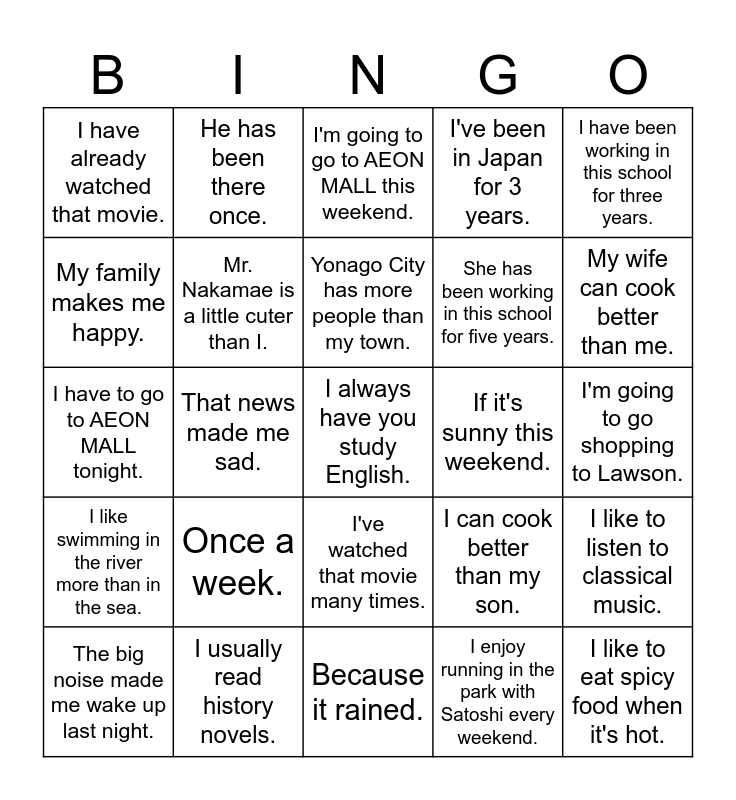 This bingo card has 45 words: Free!, I have to go to AEON MALL tonight., My white car is newer than my blue one., I have to take care of my rice field this weekend., I enjoy running in the park with Satoshi every weekend., I've just finished eating breakfast., I have already watched that movie., I like Mexican food better than American food to eat, Yonago City has more people than my town., I can cook better than my son., My wife can cook better than me., I like swimming in the river more than in the sea., Mr. Nakamae is a little cuter than I., I've watched that movie many times., I've never tried it before., I've been there many times., She has been there once., He has been there once., He has been working in this school for three years., She has been working in this school for five years., I have been working in this school for three years., Biriyani always makes me happy., That news made me sad., I'm going to go to AEON MALL this weekend., I will meet my friends in Osaka during summer vacation., I like to eat spicy food when it's hot., You look nice with it., There is a good restaurant near my house., Because it rained., If it's sunny this weekend., She gave me a chance yesterday., The big noise made me wake up last night., Once a week., Twice a week., I like Science Fiction movies., I like to listen to classical music., I usually read mystery novels., I usually read history novels., I've never been there., I've been in Japan for 3 years., I'm going to go shopping to Lawson., My family makes me happy., Shrimps make me sad., I always have you study English. and Let me think about it..
