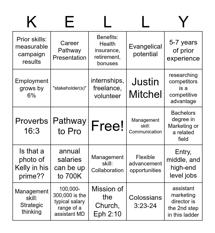 This bingo card has a free space and 29 words: Management skill: Strategic thinking, The position to cultivate the brand, Pathway to Pro, guide cross functional teams, Prior skills: measurable campaign results, Benefits: Health insurance, retirement, bonuses, "stakeholder(s)", annual salaries can be up to 700K, Management skill: Communication, 100,000-300,000 is the typical salary range of a assistant MD, Bachelors degree in Marketing or a related field, assistant marketing director is the 2nd step in this ladder, Mission of the Church, Eph 2:10, Colossians 3:23-24, researching competitors is a competitive advantage, No.1 skill: Strategic Leadership, Management skill: Collaboration, Is that a photo of Kelly in his prime??, 5-7 years of prior experience, Proverbs 16:3, Flexible advancement opportunities, Primary focus, Justin Mitchel, Employment grows by 6%, Evangelical potential, Career Pathway Presentation, Entry, middle, and high-end level jobs, internships, freelance, volunteer and chief marketing director.