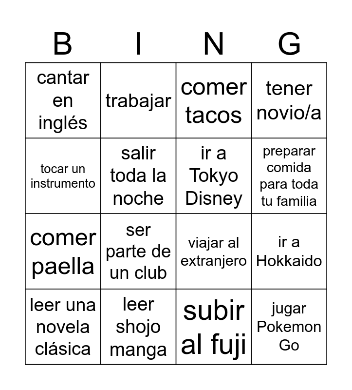 This bingo card has 16 words: leer shojo manga, ir a Hokkaido, comer tacos, cantar en inglés, comer paella, trabajar, viajar al extranjero, subir al fuji, tocar un instrumento, salir toda la noche, leer una novela clásica, tener novio/a, ser parte de un club, preparar comida para toda tu familia, ir a Tokyo Disney and jugar Pokemon Go.