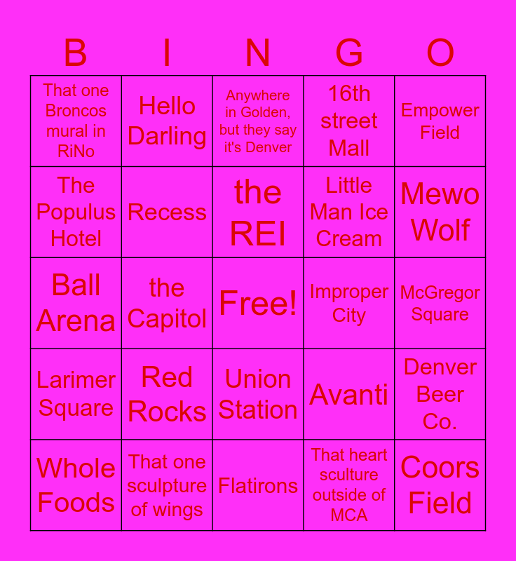 This bingo card has a free space and 24 words: Red Rocks, That one sculpture of wings, the REI, Whole Foods, Empower Field, That one Broncos mural in RiNo, The Populus Hotel, Hello Darling, Improper City, Union Station, Little Man Ice Cream, Ball Arena, Avanti, Denver Beer Co., Recess, That heart sculture outside of MCA, McGregor Square, Anywhere in Golden, but they say it's Denver, Mewo Wolf, the Capitol, Coors Field, Larimer Square, 16th street Mall and Flatirons.