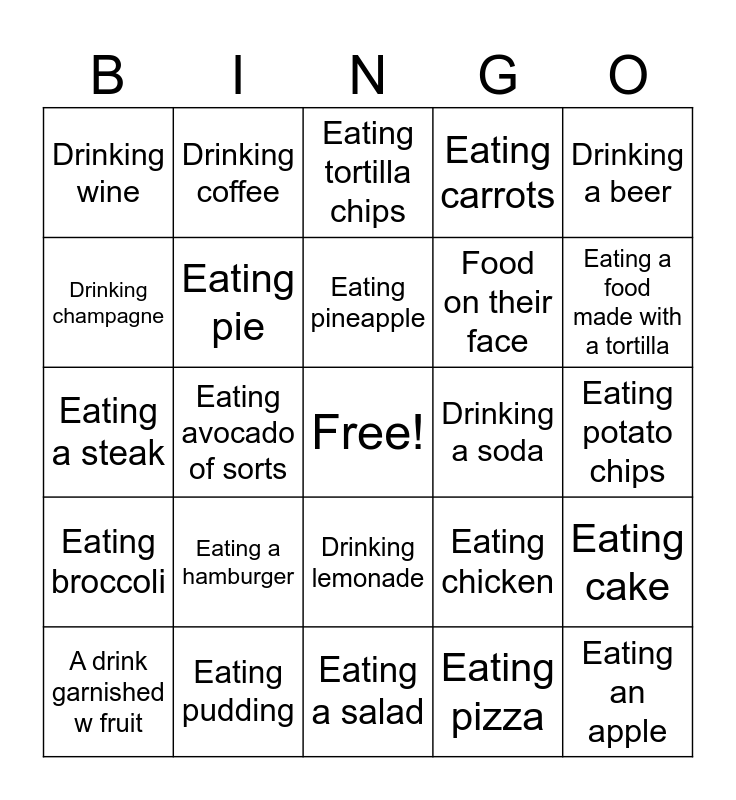 This bingo card has a free space and 25 words: Eating a hamburger, Eating a salad, Eating pineapple, A drink garnished w fruit, Drinking a beer, Drinking wine, Drinking champagne, Drinking coffee, Drinking a soda, Drinking lemonade, Food on their face, Eating a steak, Eating chicken, Eating cake, Eating pie, Eating a cookie, Eating potato chips, Eating tortilla chips, Eating a food made with a tortilla, Eating avocado of sorts, Eating an apple, Eating pudding, Eating broccoli, Eating carrots and Eating pizza.