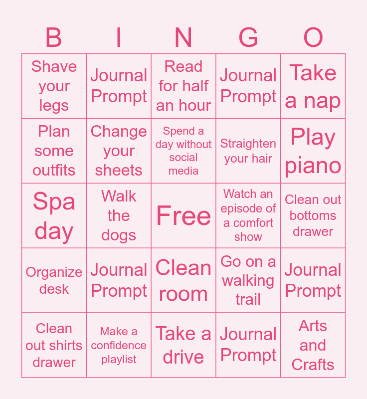 This bingo card has a free space and 24 words: Journal Prompt, Make a confidence playlist, Spend a day without social media, Clean out shirts drawer, Take a nap, Shave your legs, Plan some outfits, Journal Prompt, Watch an episode of a comfort show, Clean room, Straighten your hair, Spa day, Go on a walking trail, Journal Prompt, Change your sheets, Journal Prompt, Clean out bottoms drawer, Read for half an hour, Play piano, Walk the dogs, Arts and Crafts, Organize desk, Journal Prompt and Take a drive.