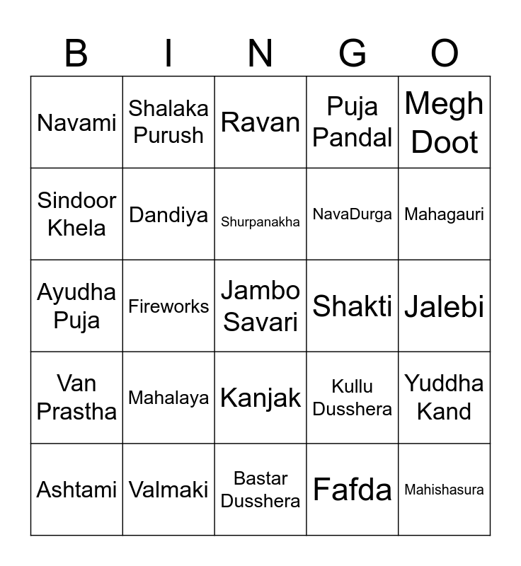This bingo card has 75 words: Vijayadashami, Navaratri, Ravan, Dashanan, Durga Puja, Ashta Lakshmi, Good over evil, Ram, Golu, Ramleela, Mahishasura, Sita, Shurpanakha, Sindoor Khela, Visarjan, Fireworks, Ravan Dahan, Jambo Savari, Kumbh Karan, Megh Doot, Mela, Ayudha Puja, Dandiya, Shalaka Purush, Puja Pandal, Dashmi, Hanuman, Ramayan, Mysore Dusshera, Puja, Kanya Puja, Garba, Kheer, Kullu Dusshera, Mahagauri, NavaDurga, Lord Raghunath, Halwa, Jalebi, Fafda, Rath Yatra, Lanka Dahan, Lanka, Nati Dance, Ghat Sthapana, Mithai, Ashtami, Navami, Pandal, Kali Puja, Dashain, Kanjak, Yatilak, Shami Tree, Demon, Apta Leaves, Utsav, Kumkum, Durgotsava, Dharma, Mahalaya, Adharama, Panchang, Avatar, Aarti, Shakti, Ayodhya, Rakshas, Sundarkand, Yuddha Kand, Van Prastha, Valmaki, Laxman, Bastar Dusshera and Pat Jatra.