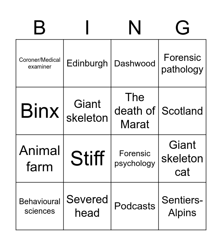 This bingo card has 24 words: Bloodletting, Fraternal, Scotland, The spider and the fly, Binx, Coroner/Medical examiner, Giant skeleton, Edinburgh, Severed head, Halloween, Animal farm, Forensic psychology, David Bowie, Clementine, The death of Marat, Nelson B-C, Podcasts, Dashwood, Stiff, Giant skeleton cat, Behavioural sciences, Sentiers-Alpins, Forensic pathology and Maisie.