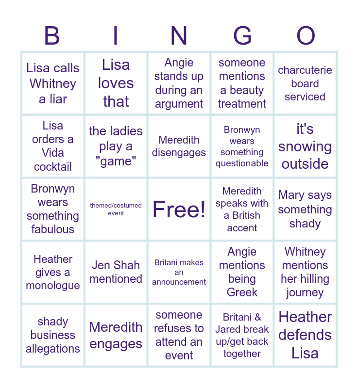 This bingo card has a free space and 24 words: Jen Shah mentioned, Meredith engages, Meredith disengages, shady business allegations, charcuterie board serviced, Lisa calls Whitney a liar, Lisa orders a Vida cocktail, Lisa loves that, Meredith speaks with a British accent, Britani makes an announcement, Bronwyn wears something questionable, Bronwyn wears something fabulous, Angie mentions being Greek, Whitney mentions her hilling journey, the ladies play a "game", Britani & Jared break up/get back together, Mary says something shady, Angie stands up during an argument, it's snowing outside, themed/costumed event, Heather defends Lisa, Heather gives a monologue, someone mentions a beauty treatment and someone refuses to attend an event.