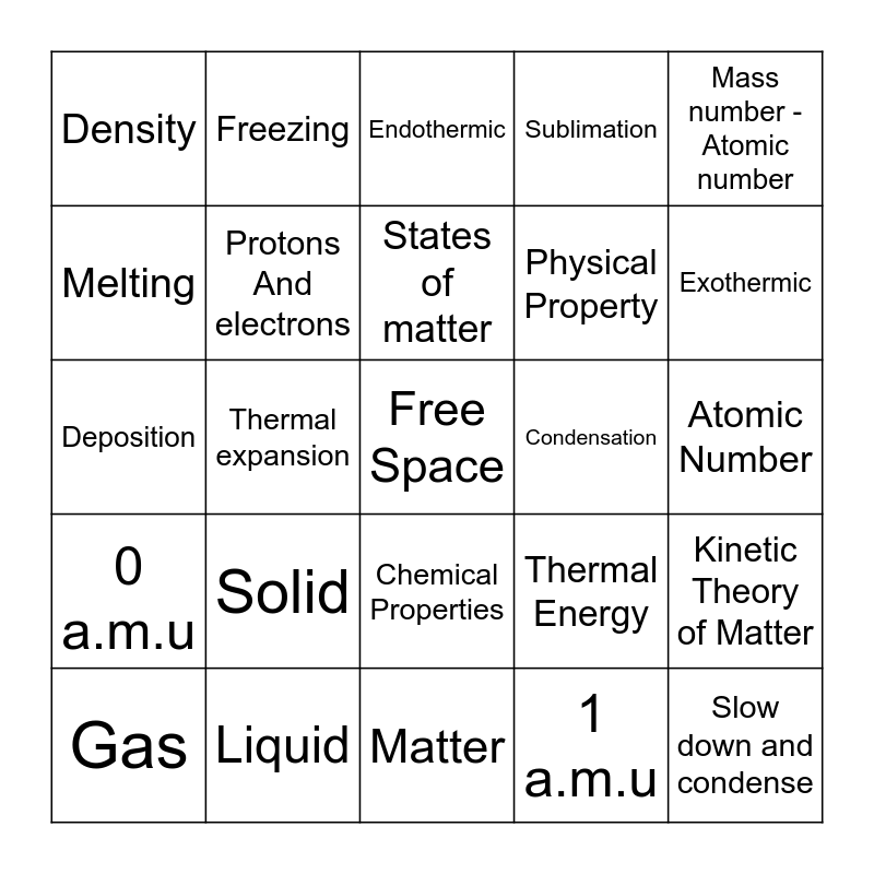 This bingo card has a free space and 24 words: Solid, Liquid, States of matter, Gas, Mass number - Atomic number, Density, Melting, Freezing, Condensation, Chemical Properties, Physical Property, Deposition, Thermal Energy, Kinetic Theory of Matter, Protons And electrons, 1 a.m.u, Atomic Number, Endothermic, Exothermic, Thermal expansion, Slow down and condense, 0 a.m.u, Sublimation and Matter.