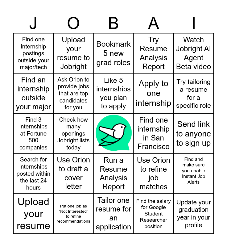This bingo card has a free space and 54 words: Create a Jobright AI account!, Use Orion to draft a cover letter, Like 3 internship postings, Download Jobright AI App, Send link to anyone to sign up, Find 5 internships that has more than 5+ qualifications, Ask Orion to provide jobs that are top candidates for you, Find 2 internships that start in winter and 2 that start in summer, Try Resume Analysis Report, Update your profile, Find one internship postings outside your major/tech, Edit and customize your job filter, Find the salary for Google Student Researcher position, Find and make sure you enable Instant Job Alerts, Ask Orion to give some resume tips, Access the Ultimate 2026 U.S Internship List, Like 5 internships you plan to apply, Apply to one internship, Use Orion to compare two job opportunities, Upload your resume, Put one job as “Not Interested” to refine recommendations, Tailor one resume for an application, Find one internship in San Francisco, Watch Jobright AI Agent Beta video, Create a Jobright account, Upload your resume to Jobright, Run a Resume Analysis Report, Ask Orion for job recommendations, Save 3 internships to your list, Find 2 remote internships, Set up instant job alerts, Like 3 job postings, Check the salary for any role, Hide a role that doesn’t interest you, Find an internship outside your major, Filter internships by location, Bookmark 5 new grad roles, Use Orion to refine job matches, Update your graduation year in your profile, Find 3 internships at Fortune 500 companies, Watch the Jobright AI Agent Beta video, Send the ACM referral link to three friends, Search for roles that support H1B visas, Apply Autofill to an internship application, Find 2 jobs in your dream city, Discover a role at a startup, Use Jobright’s company insights feature, Customize your job filter settings, Try tailoring a resume for a specific role, Search for internships posted within the last 24 hours, Check how many openings Jobright lists today, Find a job posting that mentions Python, Explore one company profile through Jobright and Compare two different job opportunities using Orion.
