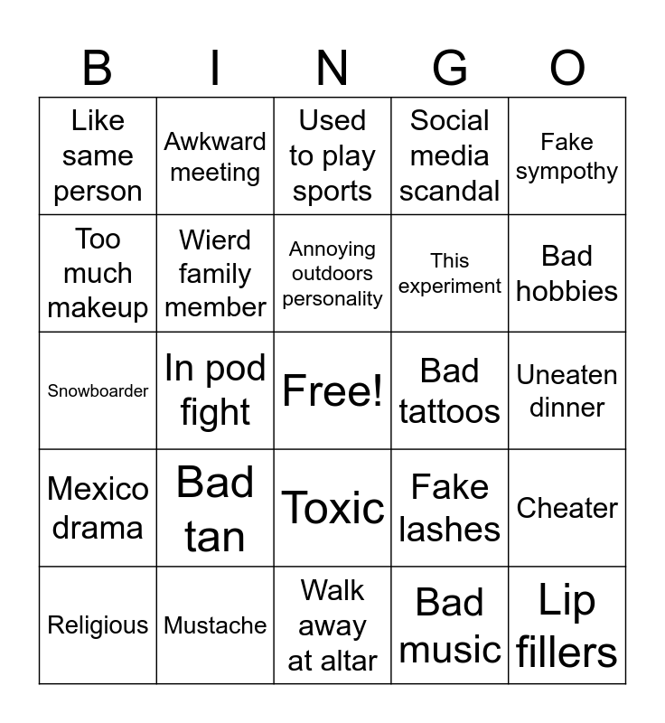 This bingo card has a free space and 24 words: Bad tan, Mustache, Annoying outdoors personality, Religious, Fake sympothy, Like same person, Too much makeup, Awkward meeting, Bad tattoos, Toxic, This experiment, Snowboarder, Fake lashes, Cheater, Wierd family member, Bad music, Uneaten dinner, Used to play sports, Bad hobbies, In pod fight, Lip fillers, Mexico drama, Social media scandal and Walk away at altar.