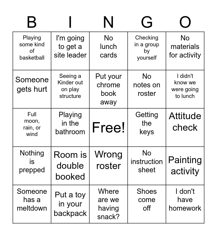 This bingo card has a free space and 24 words: Room is double booked, Put a toy in your backpack, Put your chrome book away, Someone has a meltdown, No materials for activity, Playing some kind of basketball, Someone gets hurt, I'm going to get a site leader, Getting the keys, Wrong roster, No notes on roster, Full moon, rain, or wind, No instruction sheet, Painting activity, Seeing a Kinder out on play structure, Shoes come off, Attitude check, No lunch cards, I didn't know we were going to lunch, Playing in the bathroom, I don't have homework, Nothing is prepped, Checking in a group by yourself and Where are we having snack?.