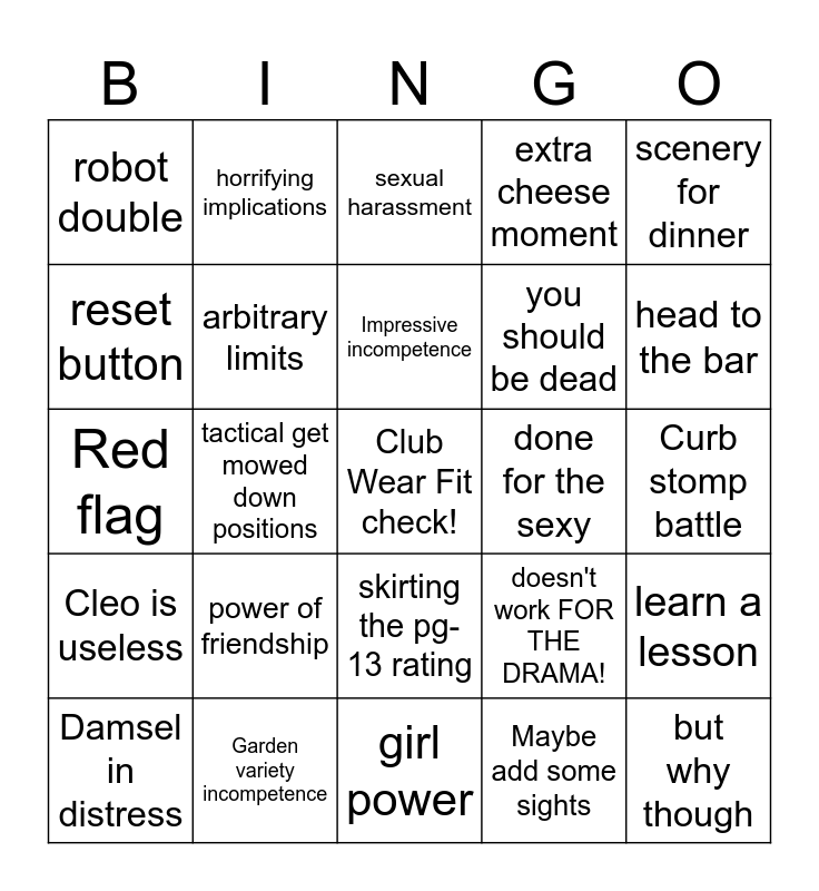 This bingo card has a free space and 31 words: girl power, that's convenient, tactical get mowed down positions, cheesy dialogue, robot double, sexual harassment, arbitrary limits, doesn't work FOR THE DRAMA!, done for the sexy, Maybe add some sights, Curb stomp battle, but why though, musical interlude, unnecessary mistrust, head to the bar, stupid plan, learn a lesson, power of friendship, Cleo is useless, skirting the pg-13 rating, scenery for dinner, misogyny, Damsel in distress, horrifying implications, you should be dead, reset button, extra cheese moment, Red flag, Garden variety incompetence, Impressive incompetence and authority figures are useless.