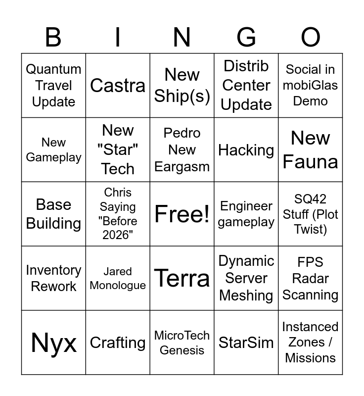 This bingo card has a free space and 25 words: Jared Monologue, MicroTech Genesis, Pedro New Eargasm, Nyx, Social in mobiGlas Demo, Quantum Travel Update, New Gameplay, Castra, Engineer gameplay, Terra, Hacking, Base Building, Dynamic Server Meshing, FPS Radar Scanning, New "Star" Tech, SC Main Story, SQ42 Stuff (Plot Twist), New Ship(s), New Fauna, Chris Saying "Before 2026", Instanced Zones / Missions, Crafting, Inventory Rework, Distrib Center Update and StarSim.