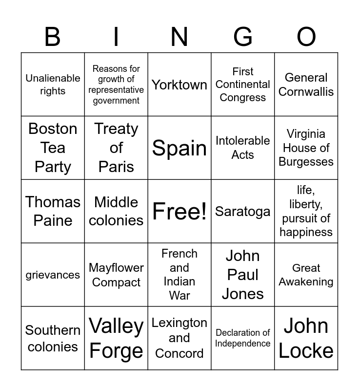 This bingo card has a free space and 29 words: Southern colonies, New England colonies, Middle colonies, Thomas Jefferson, Unalienable rights, Yorktown, Treaty of Paris, Mayflower Compact, Saratoga, Valley Forge, life, liberty, pursuit of happiness, John Locke, Lexington and Concord, Declaration of Independence, Virginia House of Burgesses, Stamp, Townshend and Sugar Acts, French and Indian War, grievances, General Cornwallis, Thomas Paine, John Paul Jones, Mercantilism, Intolerable Acts, Boston Tea Party, First Continental Congress, Reasons for growth of representative government, Great Awakening, Spain and Proclamation of 1763.