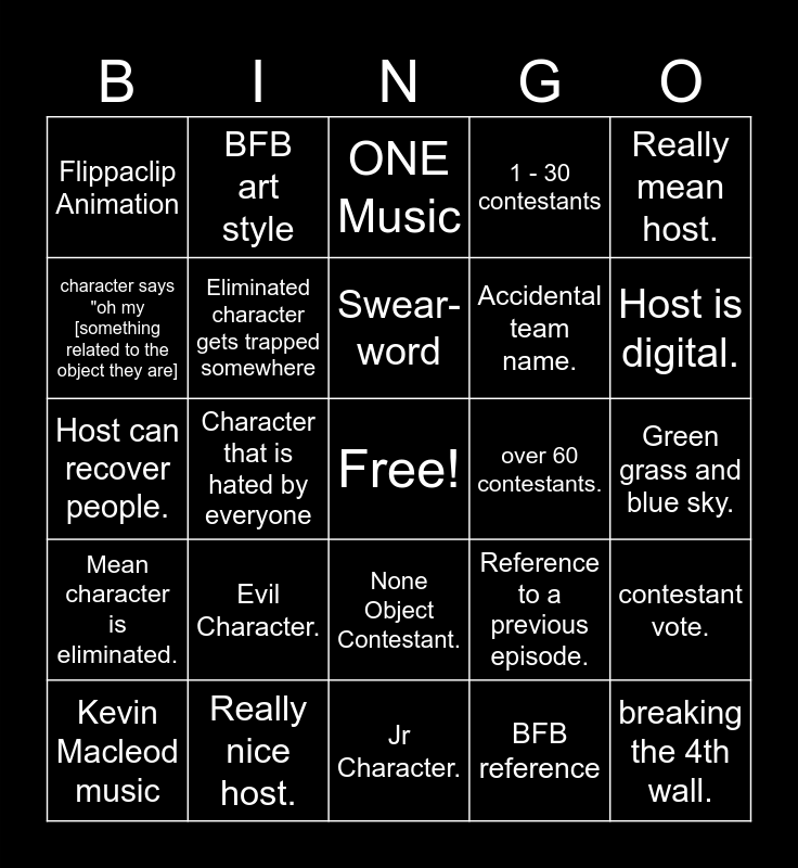 This bingo card has a free space and 44 words: Intro plays after the host activates it., breaking the 4th wall., mention of boredom., Kevin Macleod music, BFB music, BFB reference, ONE Music, Episode starts mid conversation., Really mean host., Really nice host., 1 - 30 contestants, over 60 contestants., None Object Contestant., Evil Character., Robot Character., Jr Character., Recovery Centre., Host can recover people., Creator Rigs an elimination., Host is digital., BFB art style, BFDI artstyle, Custom assets, Flippaclip Animation, Adobe Animation., Green grass and blue sky., Character shipping., Creator voices majority of the cast., Reference to a previous episode., Mean character is eliminated., Vote to eliminate., contestant vote., Vote To Save., Jacob F. Voices in the show., Character that is hated by everyone, character that is loved by everyone, cute character, Advertisement., Swear- word, character says "oh my [something related to the object they are], Accidental team name., Character gets no lines., Eliminated character gets trapped somewhere and Non alive character..