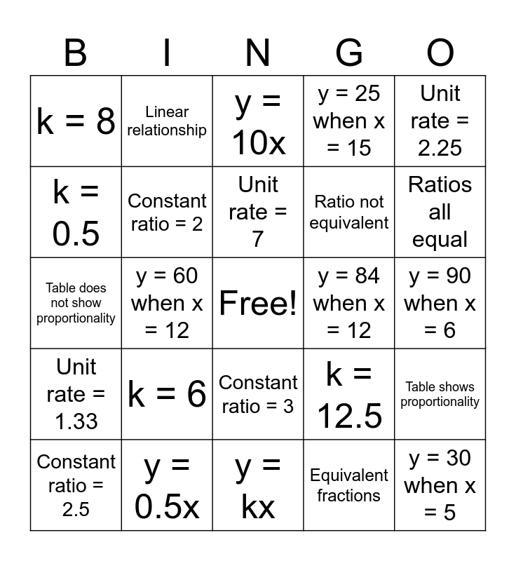 This bingo card has a free space and 39 words: Not proportional, Proportional, Constant ratio = 1.5, Constant ratio = 2, Constant ratio = 2.5, Constant ratio = 3, Unit rate = 7, Unit rate = 4.9, Unit rate = 2.25, Unit rate = 1.33, y = 60 when x = 12, y = 25 when x = 15, y = 30 when x = 5, y = 90 when x = 6, y = 84 when x = 12, k = 6, k = 7, k = 8, k = 10, k = 12.5, k = 0.5, y = kx, Ratio not equivalent, Ratios all equal, Yes, proportional relationship, No, not proportional relationship, Additive, not multiplicative, Multiplicative pattern, Direct variation, Linear relationship, y = 3/2x, y = 4x, y = 10x, y = 0.5x, Equivalent fractions, Not equivalent fractions, Table shows proportionality, Table does not show proportionality and Equation is missing constant.
