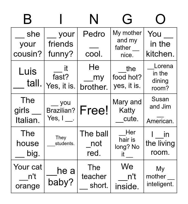 This bingo card has a free space and 24 words: They ___students., __he a baby?, He __my brother., Your cat __n't orange, You __ in the kitchen., __ she your cousin?, Luis __ tall., __ your friends funny?, Mary and Katty __cute., The ball _not red., __the food hot? yes, it is., The girls __ Italian., __Her hair is long? No it __, I __in the living room., __ it fast? Yes, it is., We __n't inside., Susan and Jim __ American., Pedro __ cool., __Lorena in the dining room?, __ you Brazilian? Yes, I __., My mother __ inteligent., The house __ big., My mother and my father __ nice. and The teacher __ short..