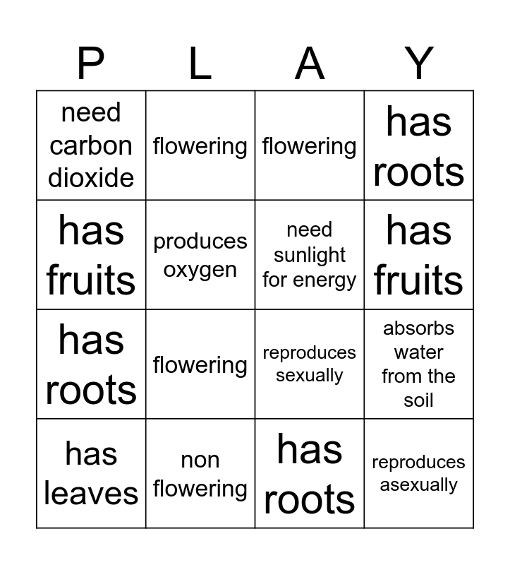 This bingo card has 25 words: provides habitat for animals, has stem, has fruits, photosyntesizes, has fruits, need carbon dioxide, produces oxygen, flowering, non flowering, absorb water from the soil, has roots, reproduces sexually, need sunlight for energy, reproduces asexually, need sunlight for energy, provides food for people, has roots, flowering, flowering, absorbs water from the soil, has leaves, provides food for animals, reproduces asexually, has roots and has roots.