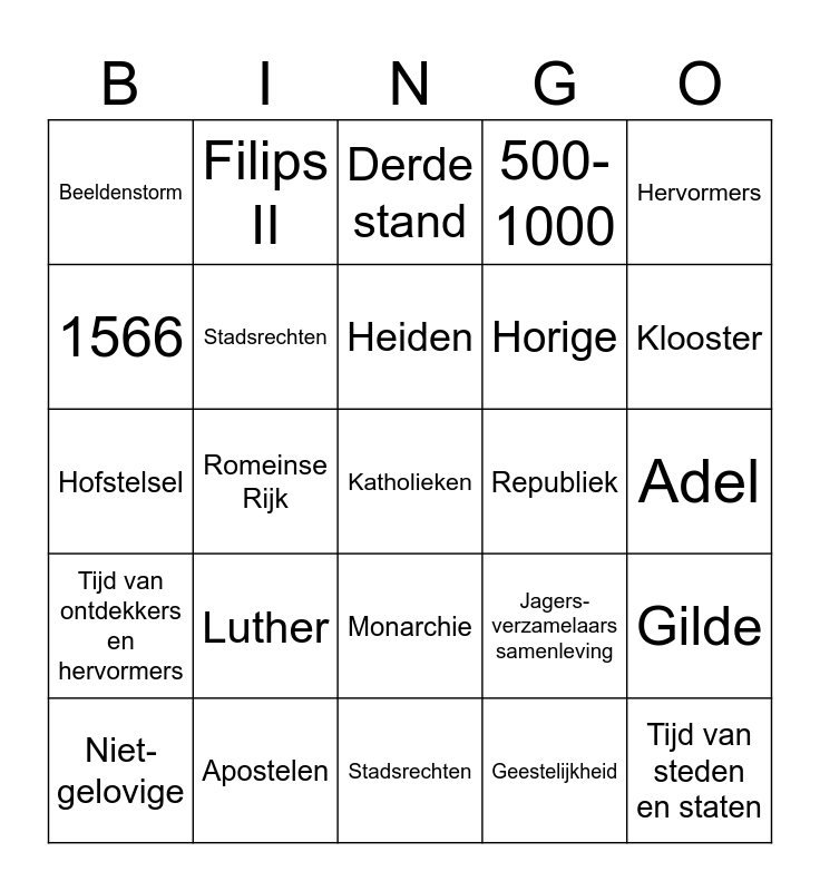 This bingo card has a free space and 24 words: Luther, Apostelen, Heiden, Niet- gelovige, Hervormers, Beeldenstorm, 1566, Filips II, Republiek, Monarchie, Horige, Hofstelsel, Jagers-verzamelaars samenleving, Gilde, Stadsrechten, Geestelijkheid, Adel, Derde stand, Klooster, Romeinse Rijk, Tijd van steden en staten, Tijd van ontdekkers en hervormers, 500-1000 and Stadsrechten.