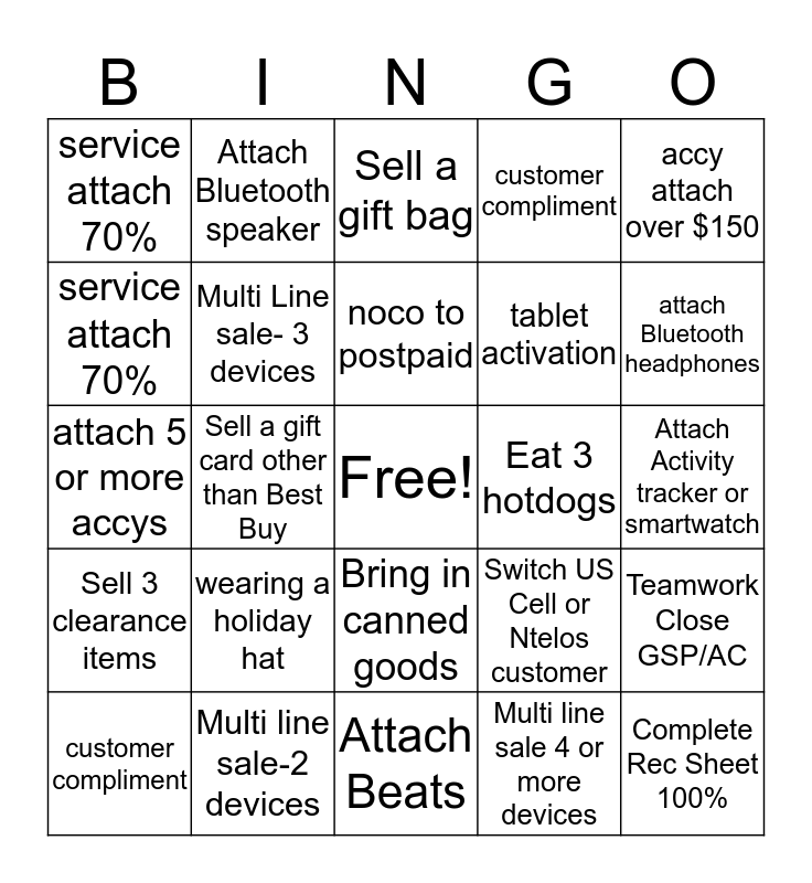 This bingo card has a free space and 24 words: wearing a holiday hat, Multi line sale-2 devices, noco to postpaid, customer compliment, accy attach over $150, service attach 70%, service attach 70%, Attach Bluetooth speaker, Eat 3 hotdogs, Bring in canned goods, tablet activation, attach 5 or more accys, Switch US Cell or Ntelos customer, Teamwork Close GSP/AC, Multi Line sale- 3 devices, Multi line sale 4 or more devices, Attach Activity tracker or smartwatch, Sell a gift bag, attach Bluetooth headphones, Sell a gift card other than Best Buy, Complete Rec Sheet 100%, Sell 3 clearance items, customer compliment and Attach Beats.