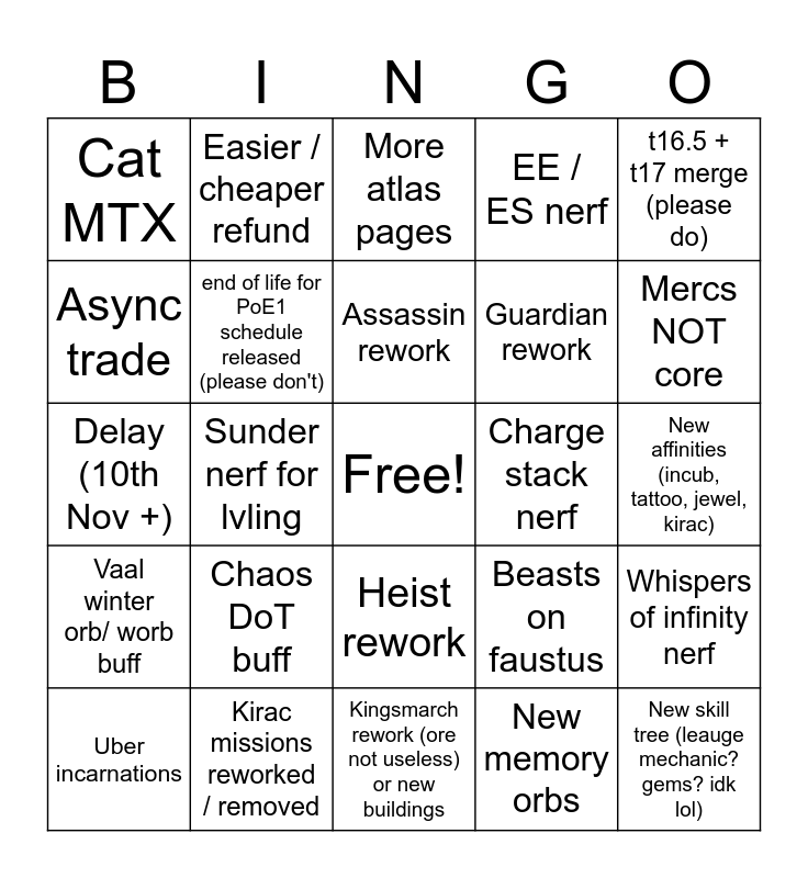 This bingo card has a free space and 24 words: Chaos DoT buff, Kirac missions reworked / removed, Assassin rework, Uber incarnations, t16.5 + t17 merge (please do), Cat MTX, Async trade, Easier / cheaper refund, Charge stack nerf, Heist rework, Guardian rework, Delay (10th Nov +), Beasts on faustus, Whispers of infinity nerf, end of life for PoE1 schedule released (please don't), New memory orbs, New affinities (incub, tattoo, jewel, kirac), More atlas pages, Mercs NOT core, Sunder nerf for lvling, New skill tree (leauge mechanic? gems? idk lol), Vaal winter orb/ worb buff, EE / ES nerf and Kingsmarch rework (ore not useless) or new buildings.
