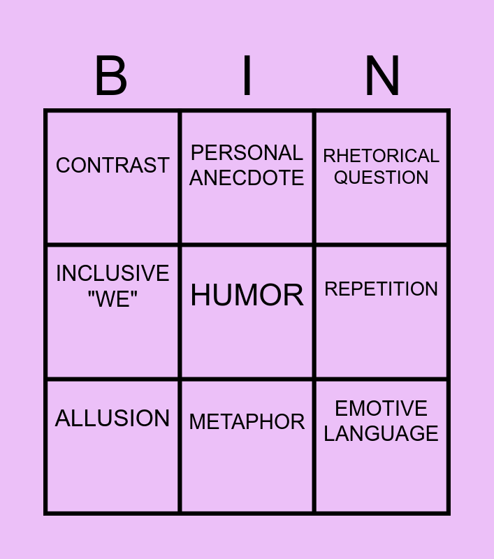 This bingo card has a free space and 8 words: REPETITION, RHETORICAL QUESTION, PERSONAL ANECDOTE, ALLUSION, CONTRAST, EMOTIVE LANGUAGE, INCLUSIVE "WE" and METAPHOR.