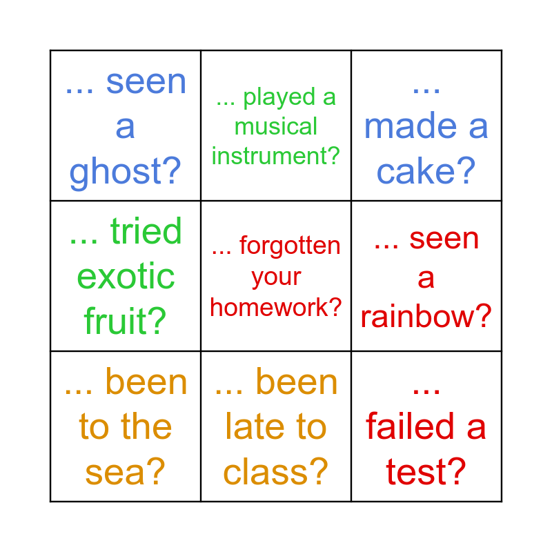 This bingo card has a free space and 8 words: ... seen a rainbow?, ... made a cake?, ... played a musical instrument?, ... been to the sea?, ... seen a ghost?, ... failed a test?, ... tried exotic fruit? and ... been late to class?.