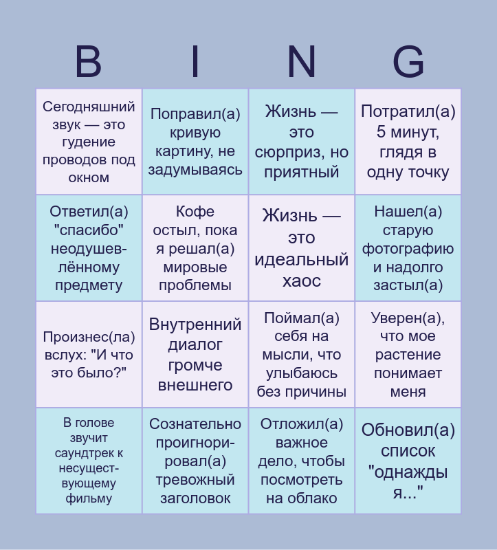 This bingo card has 16 words: Сознательно проигнори-ровал(а) тревожный заголовок, Уверен(а), что мое растение понимает меня, Жизнь — это сюрприз, но приятный, Сегодняшний звук — это гудение проводов под окном, Произнес(ла) вслух: "И что это было?", Поправил(а) кривую картину, не задумываясь, Поймал(а) себя на мысли, что улыбаюсь без причины, Отложил(а) важное дело, чтобы посмотреть на облако, Ответил(а) "спасибо" неодушев-лённому предмету, Кофе остыл, пока я решал(а) мировые проблемы, В голове звучит саундтрек к несущест-вующему фильму, Потратил(а) 5 минут, глядя в одну точку, Внутренний диалог громче внешнего, Нашел(а) старую фотографию и надолго застыл(а), Жизнь — это идеальный хаос and Обновил(а) список "однажды я...".