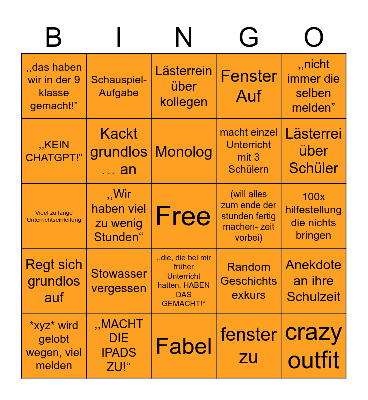 This bingo card has a free space and 25 words: Stowasser vergessen, Fabel, Monolog, *xyz* wird gelobt wegen, viel melden, ,,nicht immer die selben melden”, ,,das haben wir in der 9 klasse gemacht!”, ,,KEIN CHATGPT!”, Schauspiel-Aufgabe, (will alles zum ende der stunden fertig machen- zeit vorbei), ,,die, die bei mir früher Unterricht hatten, HABEN DAS GEMACHT!‘‘, macht einzel Unterricht mit 3 Schülern, Vieel zu lange Unterrichtseinleitung, Random Geschichts exkurs, Anekdote an ihre Schulzeit, Kackt grundlos … an, ,,MELDET EUCH DOCH MAL!‘‘, 100x hilfestellung die nichts bringen, Lästerrein über kollegen, Lästerrei über Schüler, ,,Wir haben viel zu wenig Stunden‘‘, crazy outfit, ,,MACHT DIE IPADS ZU!‘‘, Regt sich grundlos auf, Fenster Auf and fenster zu.