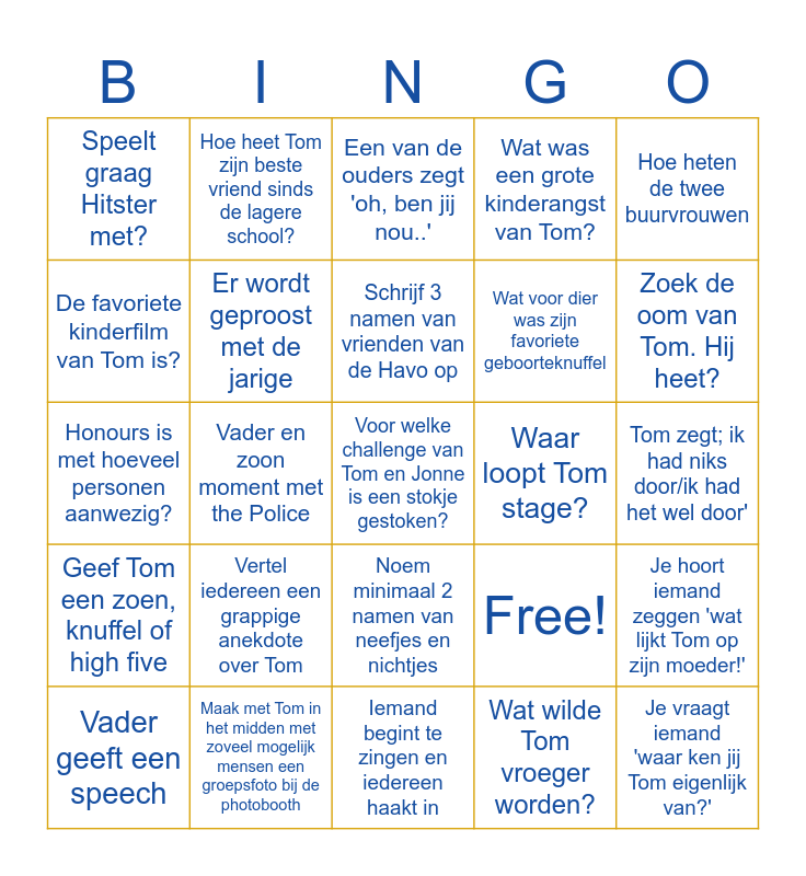 This bingo card has 25 words: Vertel iedereen een grappige anekdote over Tom, Iemand begint te zingen en iedereen haakt in, Schrijf 3 namen van vrienden van de Havo op, Vader geeft een speech, Hoe heten de twee buurvrouwen, Speelt graag Hitster met?, De favoriete kinderfilm van Tom is?, Hoe heet Tom zijn beste vriend sinds de lagere school?, Waar loopt Tom stage?, Noem minimaal 2 namen van neefjes en nichtjes, Wat voor dier was zijn favoriete geboorteknuffel, Honours is met hoeveel personen aanwezig?, Free!, Je hoort iemand zeggen 'wat lijkt Tom op zijn moeder!', Er wordt geproost met de jarige, Je vraagt iemand 'waar ken jij Tom eigenlijk van?', Tom zegt; ik had niks door/ik had het wel door', Een van de ouders zegt 'oh, ben jij nou..', Zoek de oom van Tom. Hij heet?, Vader en zoon moment met the Police, Voor welke challenge van Tom en Jonne is een stokje gestoken?, Maak met Tom in het midden met zoveel mogelijk mensen een groepsfoto bij de photobooth, Geef Tom een zoen, knuffel of high five, Wat was een grote kinderangst van Tom? and Wat wilde Tom vroeger worden?.