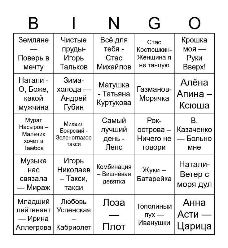 This bingo card has a free space and 34 words: Седая ночь — Юрий Шатунов, Тополиный пух — Иванушки, Фантазер — Ярослав Евдокимов, С днем рождения — Ирина Аллегрова, Музыка нас связала — Мираж, Зима-холода — Андрей Губин, Крошка моя — Руки Вверх!, Младший лейтенант — Ирина Аллегрова, Чистые пруды- Игорь Тальков, Вологда - Песняры, Матушка - Татьяна Куртукова, Всё для тебя - Стас Михайлов, Трава у дома - Земляне, Кино – Группа крови, Рок-острова – Ничего не говори, Алёна Апина – Ксюша, Любовь Успенская – Кабриолет, Мурат Насыров – Мальчик хочет в Тамбов, Игорь Николаев – Такси, такси, Жуки – Батарейка, Комбинация – Вишнёвая девятка, Виктор Салтыков — Кони в яблоках, Земляне — Поверь в мечту, В. Казаченко — Больно мне, Лоза — Плот, Анна Асти — Царица, Стас Костюшкин- Женщина я не танцую, Ленинград — Экспонат, Газманов- Морячка, Натали - О, Боже, какой мужчина, Любэ - Конь, Михаил Боярский - Зеленоглазое такси, Натали- Ветер с моря дул and IOWA — «Улыбайся».