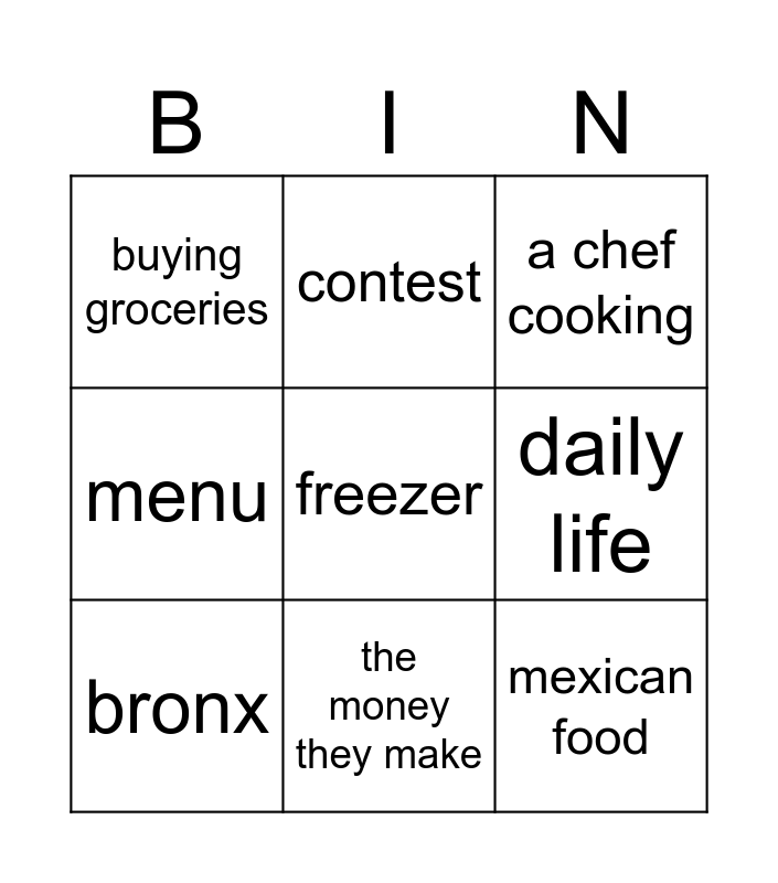 This bingo card has a free space and 8 words: daily life, a chef cooking, contest, bronx, buying groceries, mexican food, menu and the money they make.