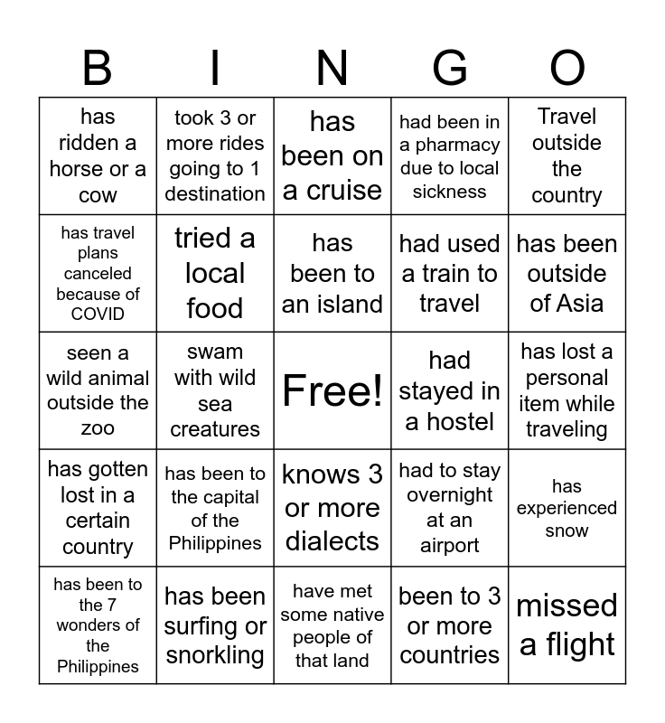 This bingo card has a free space and 24 words: has been to the capital of the Philippines, has been surfing or snorkling, has been to an island, has been to the 7 wonders of the Philippines, Travel outside the country, has ridden a horse or a cow, has travel plans canceled because of COVID, took 3 or more rides going to 1 destination, had stayed in a hostel, knows 3 or more dialects, had used a train to travel, seen a wild animal outside the zoo, had to stay overnight at an airport, has experienced snow, tried a local food, been to 3 or more countries, has lost a personal item while traveling, has been on a cruise, has been outside of Asia, swam with wild sea creatures, missed a flight, has gotten lost in a certain country, had been in a pharmacy due to local sickness and have met some native people of that land.