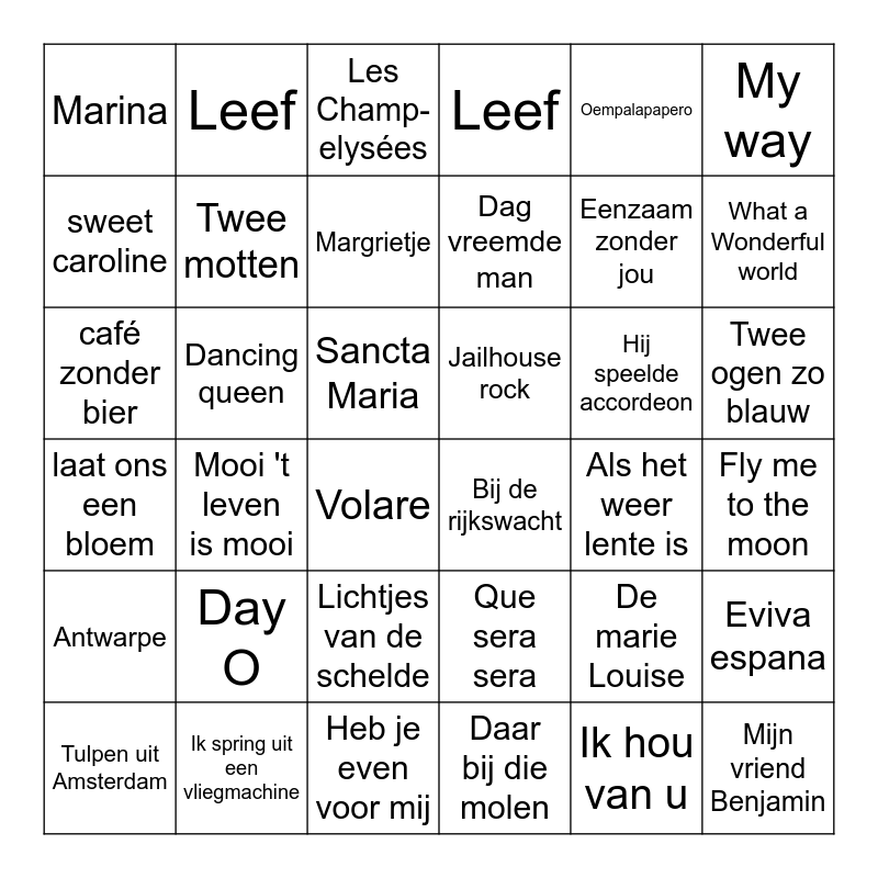 This bingo card has 36 words: Que sera sera, Lichtjes van de schelde, Daar bij die molen, sweet caroline, laat ons een bloem, Jailhouse rock, Twee motten, Heb je even voor mij, Oempalapapero, De marie Louise, What a Wonderful world, Leef, Eviva espana, Dancing queen, Dag vreemde man, Marina, Antwarpe, Hij speelde accordeon, café zonder bier, Les Champ-elysées, Sancta Maria, Mooi 't leven is mooi, Bij de rijkswacht, Volare, Als het weer lente is, Leef, Eenzaam zonder jou, Ik spring uit een vliegmachine, Margrietje, My way, Mijn vriend Benjamin, Tulpen uit Amsterdam, Fly me to the moon, Twee ogen zo blauw, Day O and Ik hou van u.