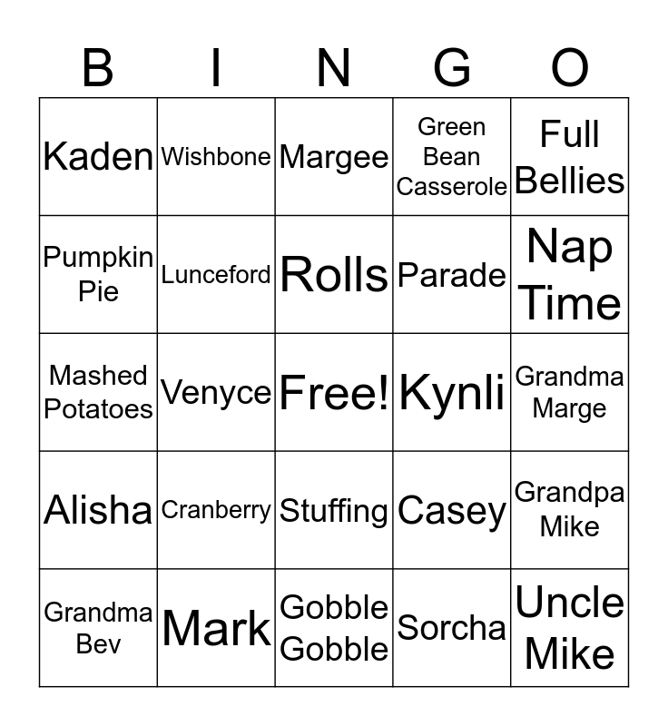This bingo card has a free space and 35 words: Smoked Turkey, Martinez, Ruff, Lunceford, Stuffing, Green Bean Casserole, Pumpkin Pie, Cranberry Sauce, Rolls, Salad, Mashed Potatoes, Full Bellies, Cheese Ball, Keaton, Kaden, Kynli, Sorcha, Venyce, Alisha, Uncle Mike, Casey, Grandma Bev, Grandpa Mike, Mark, Margee, Nap Time, Football, Games, Parade, Grandma Marge, Thanksgiving, Gobble Gobble, Cranberry, Wishbone and Stretchy Pants.