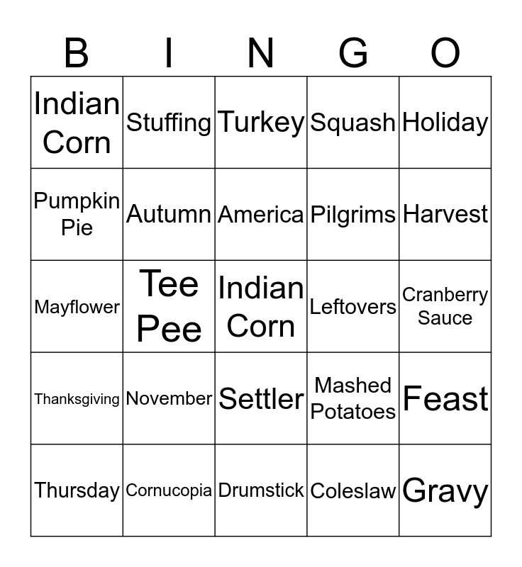 This bingo card has 25 words: November, Drumstick, America, Thursday, Holiday, Indian Corn, Pumpkin Pie, Stuffing, Leftovers, Settler, Pilgrims, Mayflower, Mashed Potatoes, Feast, Autumn, Gravy, Cranberry Sauce, Turkey, Harvest, Tee Pee, Indian Corn, Cornucopia, Thanksgiving, Squash and Coleslaw.