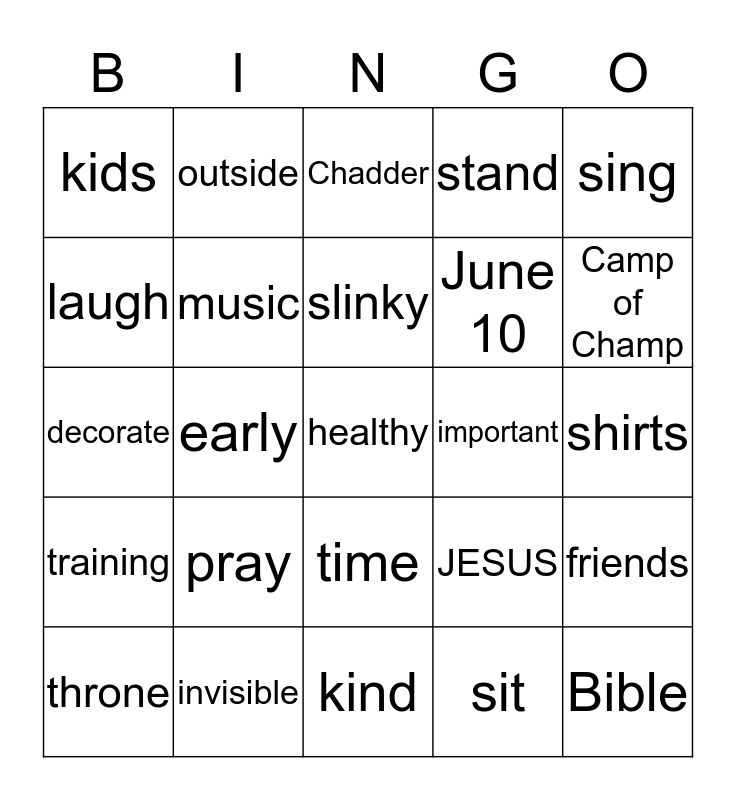 This bingo card has 25 words: pray, kind, slinky, throne, sing, kids, laugh, outside, important, time, June 10, decorate, JESUS, friends, music, Bible, shirts, Chadder, Camp of Champ, early, healthy, invisible, training, stand and sit.