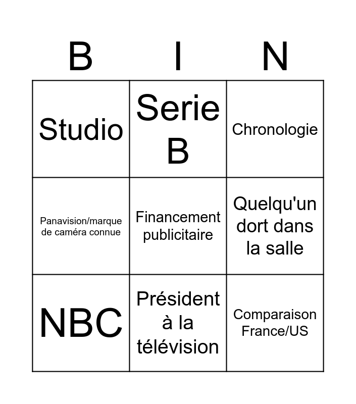 This bingo card has a free space and 8 words: Quelqu'un dort dans la salle, Chronologie, Serie B, NBC, Studio, Comparaison France/US, Panavision/marque de caméra connue and Président à la télévision.
