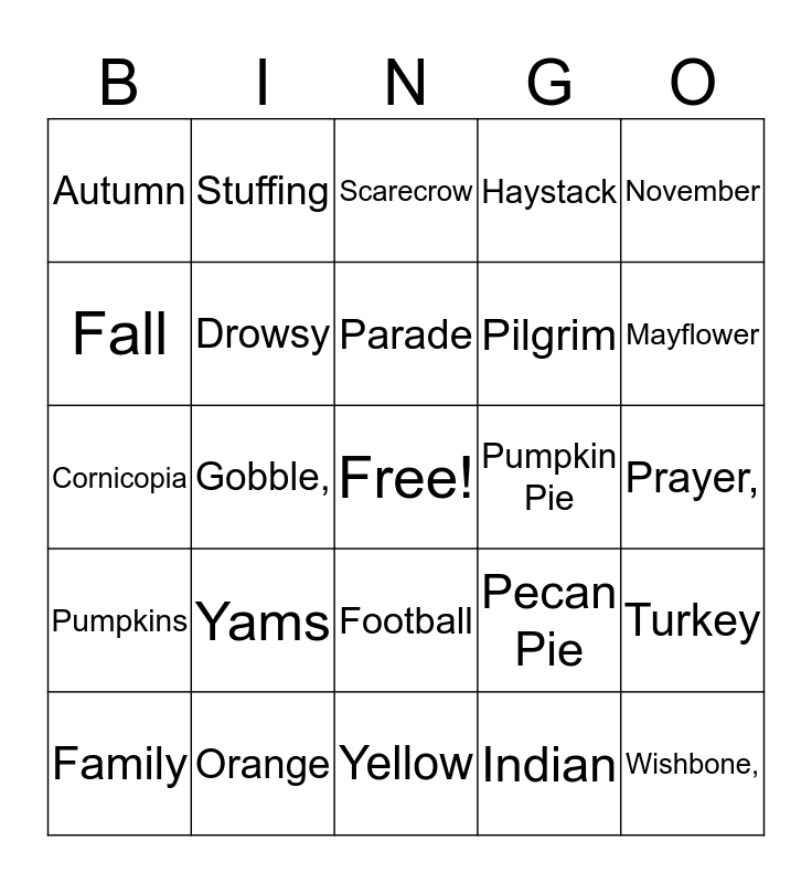 This bingo card has a free space and 28 words: Turkey, Mashed Potatoes, Pilgrim, Indian, Fall, Scarecrow, Stuffing, Pumpkins, Pumpkin Pie, Family, Cornicopia, Haystack, Orange, Yellow, Mayflower, Cranberries, Yams, Drowsy, Parade, Football, Autumn, Carve,, Wishbone,, Gobble,, Prayer,, Pecan Pie, November and Oven.